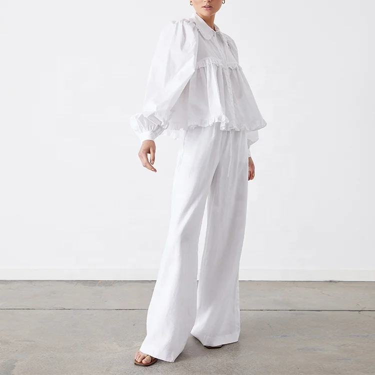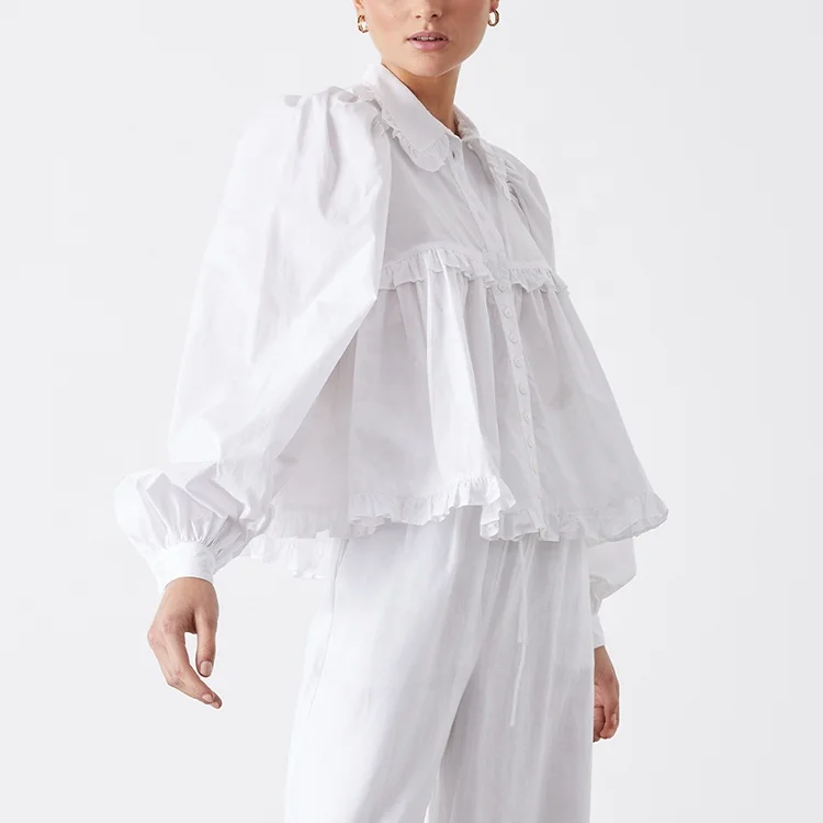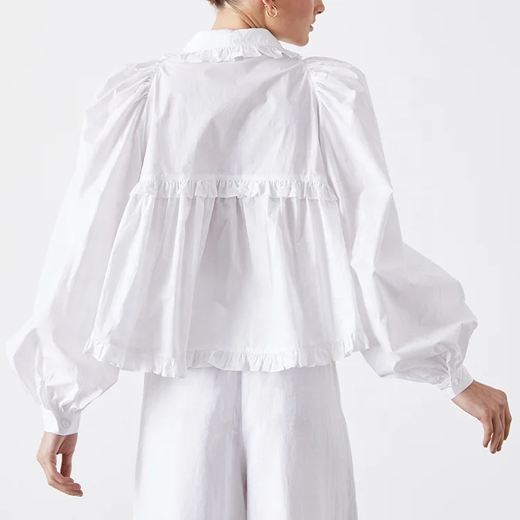 Female Top Classic Collar With Ruffle Edge Blouse Ladies Turn Down Collar Office Elegant Blouse Cotton White Shirt